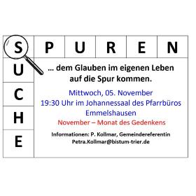 | | | | | |  |  | Pfarrbüro der Pfarrei Vorderhunsrück St. Hildegard |  |  |  | Spurensuche |  |  |  | 5. Nov. 2025 Petra Kollmar Herzliche Einladung zur "Spurensuche" im November. |  |  |  | » Weiterlesen |